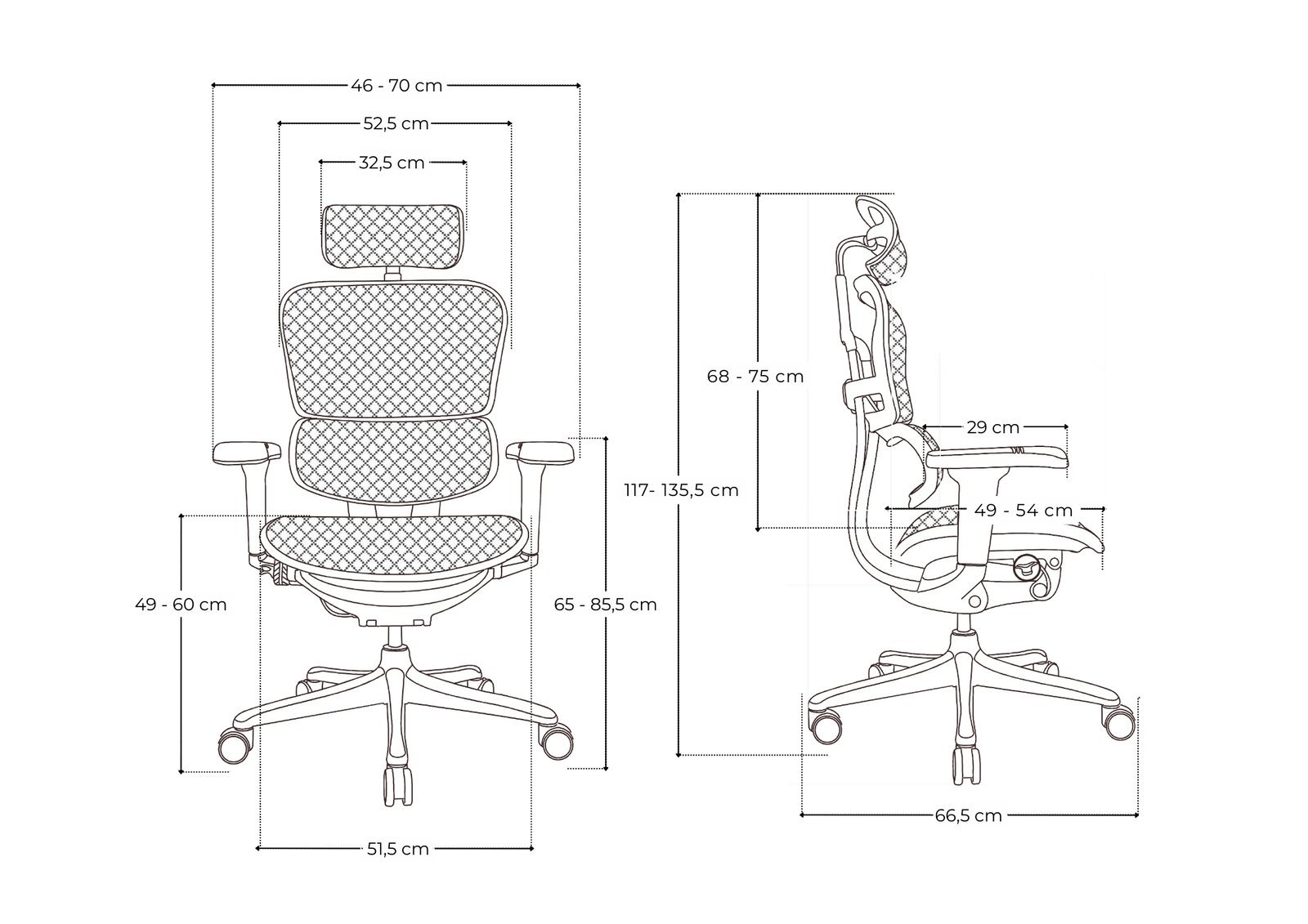 Altura da base até o apoio de braços: 65 - 85,5 cm